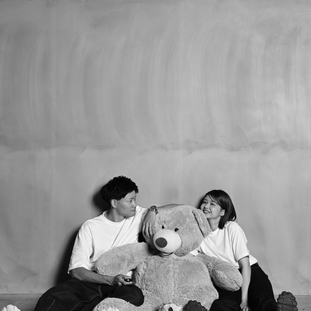 シンプルな背景でも、おしゃれ度が一気にアップします。 - ぬいぐるみを抱えて仲良しポーズ