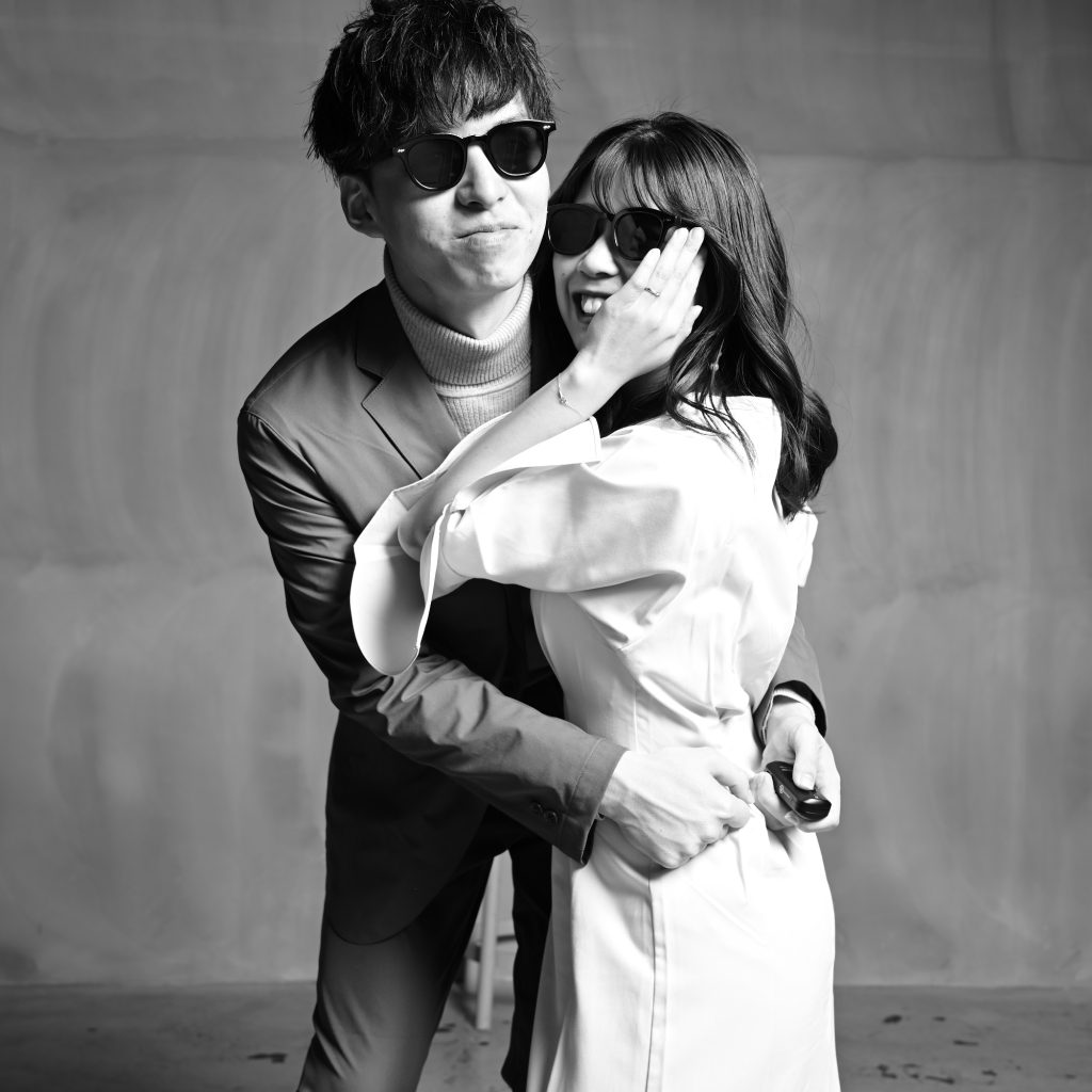 仲良し感が伝わる定番スタイル。 - 片方だけサングラスをかけて見つめ合う