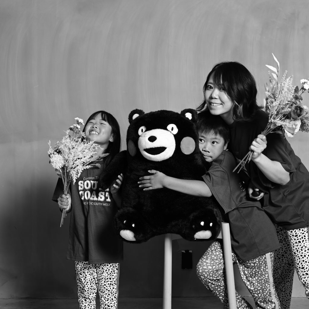 1. ぬいぐるみを抱っこして、家族全員で笑顔
