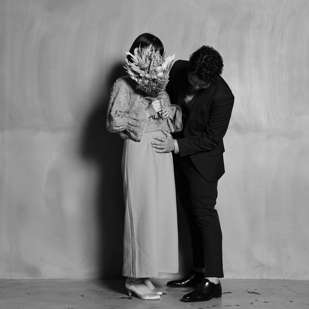 お腹にタッチする手の上に、ベビーシューズやエコー写真を置くと、ストーリー性のある写真に仕上がります。セルフ写真館では小物の持ち込みができることも多いので、事前に確認してみるのがおすすめです。