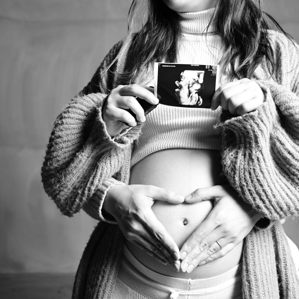 ハートの中にベビーシューズやエコー写真を入れて撮影すると、物語性のある一枚に。セルフ写真館なら小物を持ち込んでアレンジできます。