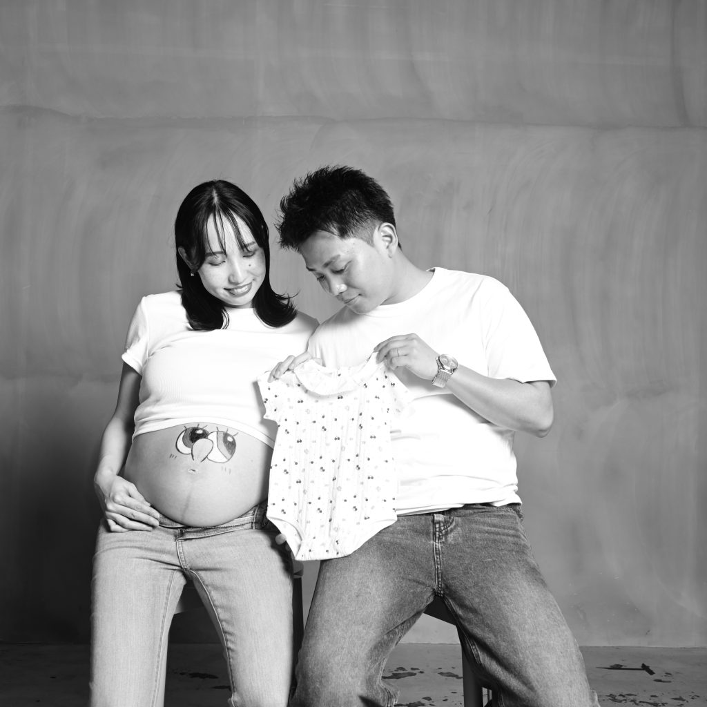 生まれてくる赤ちゃんのために用意した服を使うことで、未来を感じられる特別な写真が残せます。セルフ写真館でも持ち込みOKの場合が多く、気軽に実践できるポーズです。