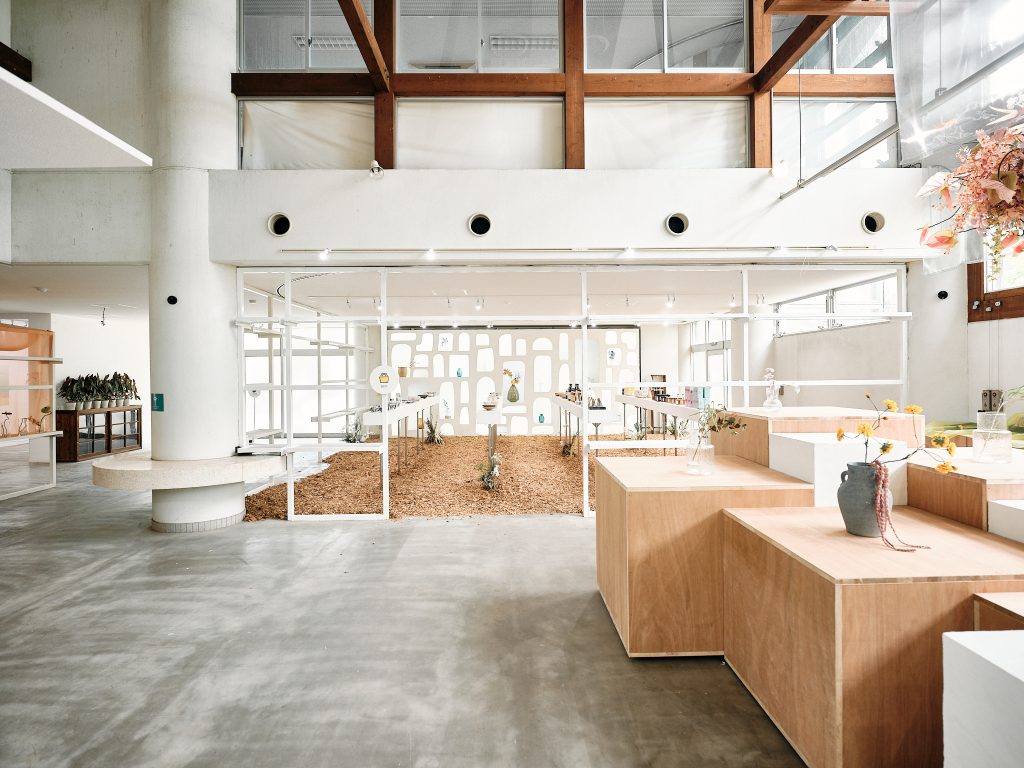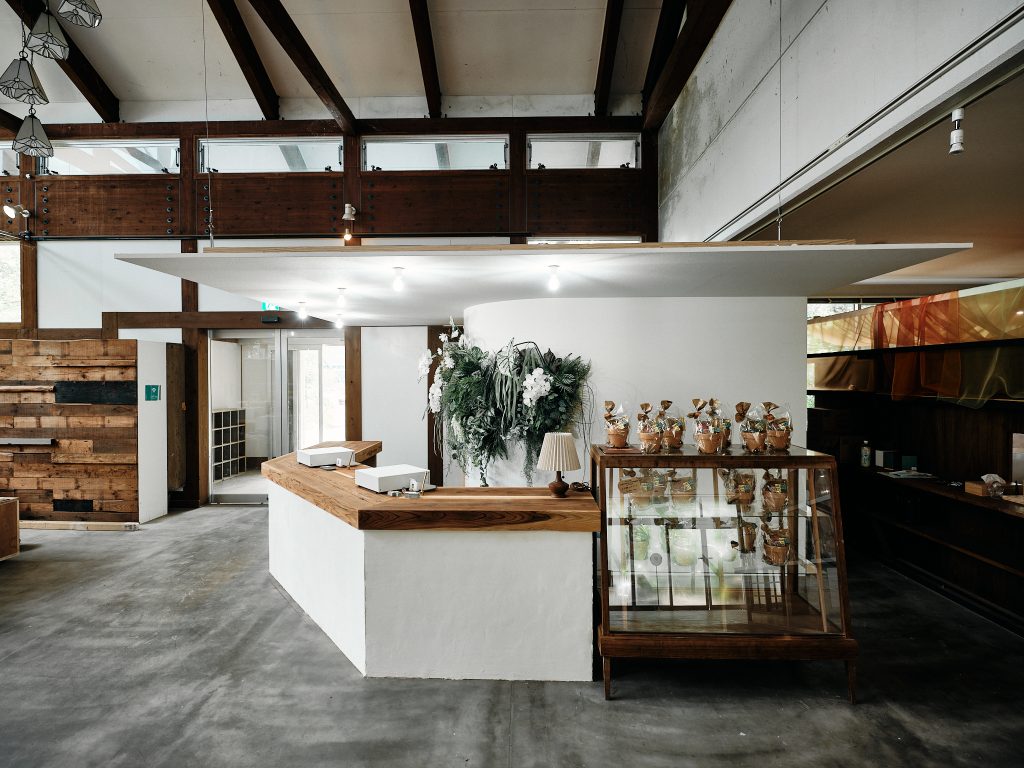 白い壁と木材、そして床に敷かれたウッドチップが、自然と調和した心地よい雰囲気をつくり出していました。