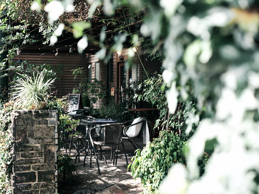 外観の植栽と店内の木のインテリアが一体となり、「お菓子を通じた癒しの時間」を感じさせます。