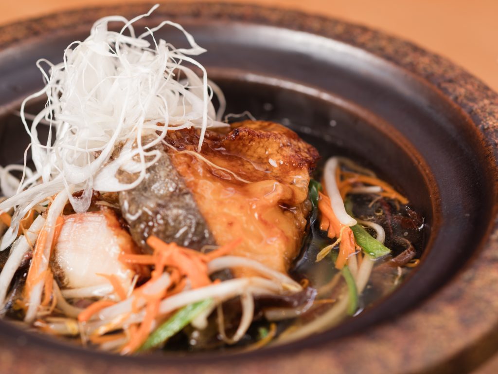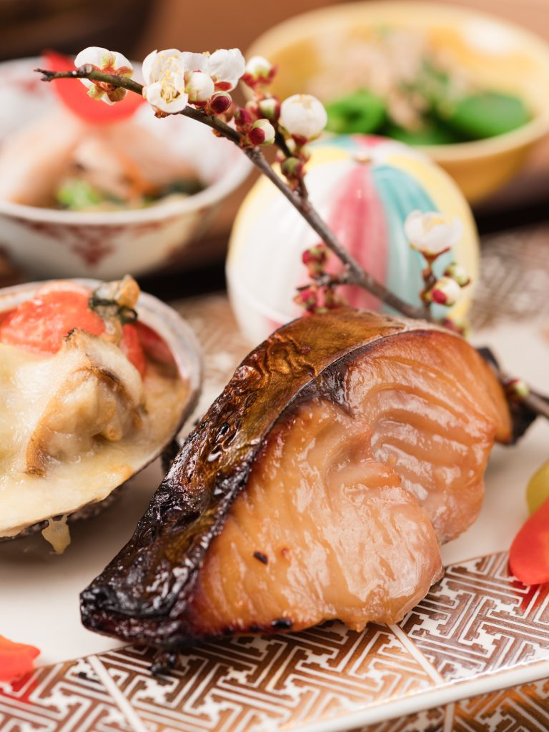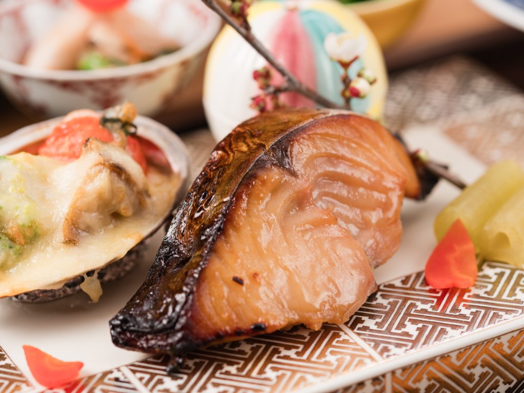香ばしく焼き上げた鰆に、旬の野菜と小鉢を添えた御膳。