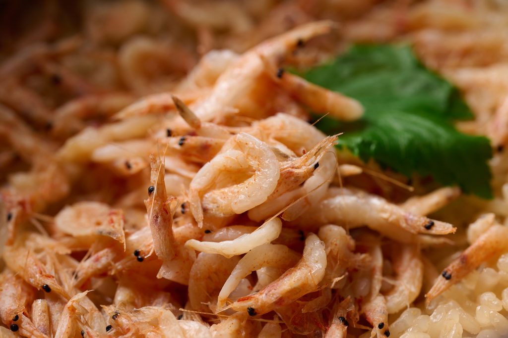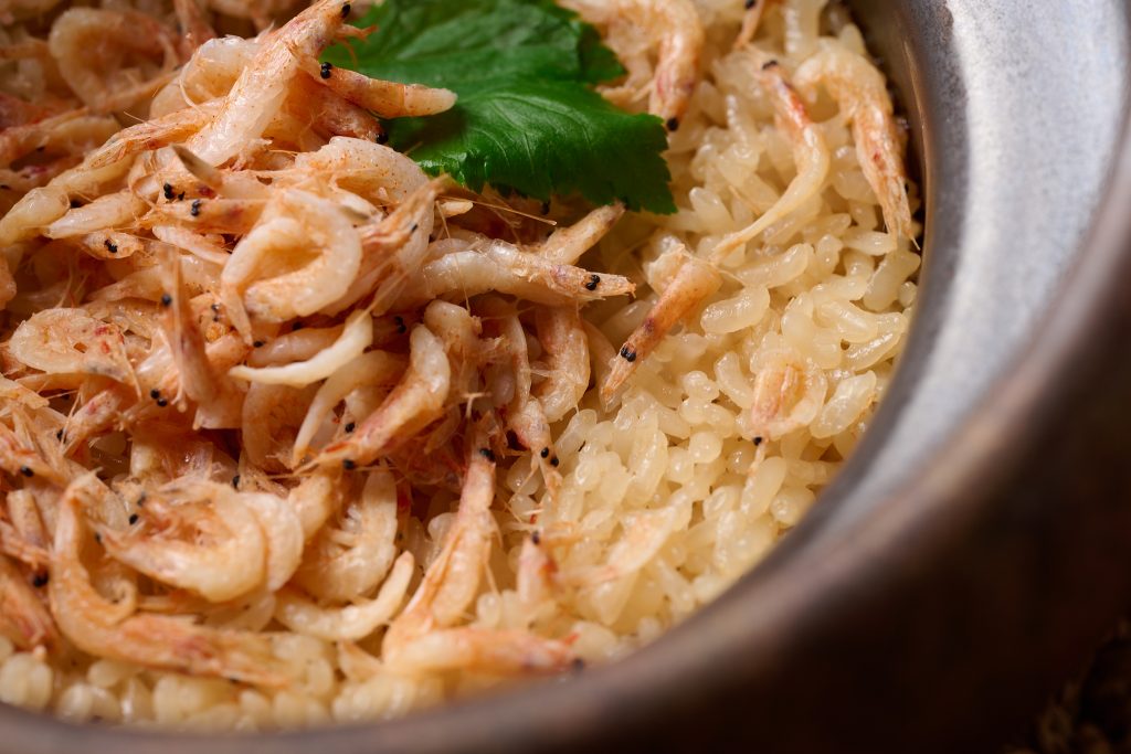 ふっくらと炊き上げたご飯の中に、えびの風味と春の香りが広がります。