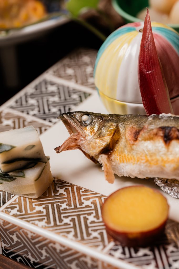 清流を思わせる清々しい香りが広がる鮎の塩焼きと、