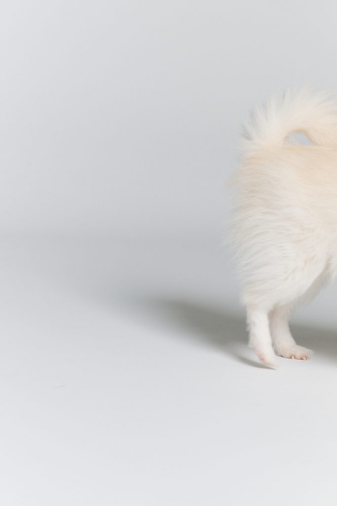 白を基調としたナチュラルな空間で、ポメラニアンのふわふわな毛並みが一層引き立ちます。