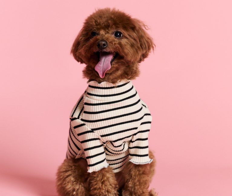 白を基調としたナチュラルな空間で、ポメラニアンのふわふわな毛並みが一層引き立ちます。
