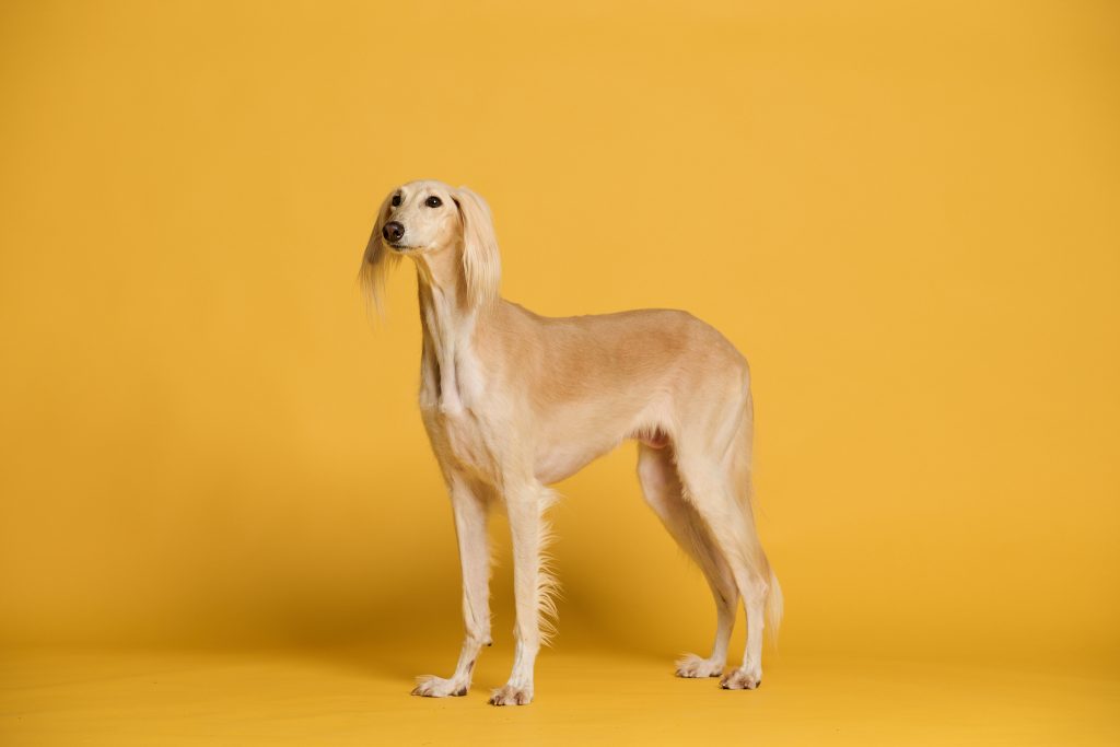 サルーキは体格がスリムで脚が長く、立ち姿のバランスが非常に美しいため、