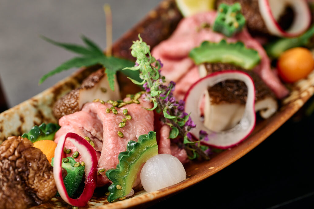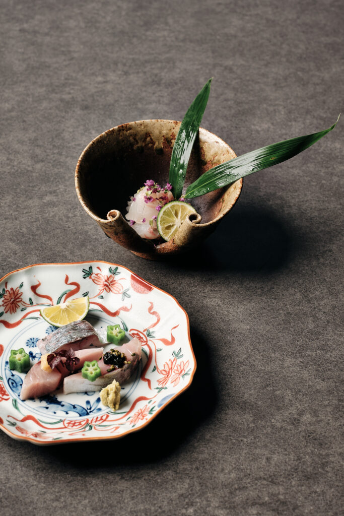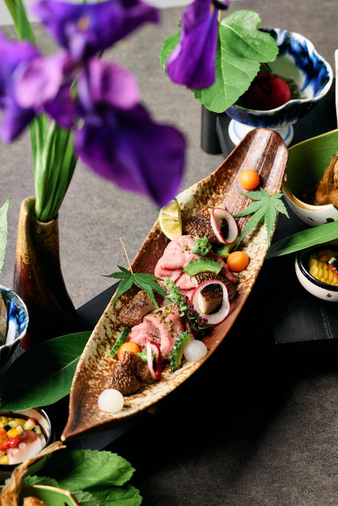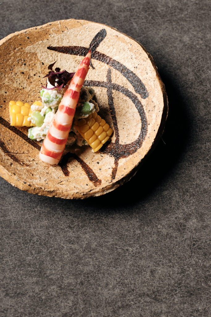 器の土の質感や“和の筆跡”まで写し込み、前菜の繊細さと季節の移ろいをそのまま切り取っています。