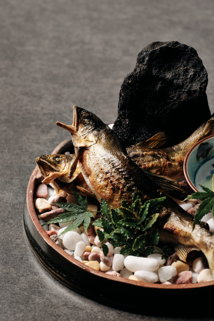 炭火で焼き上げた鮎の香ばしさ、川辺を思わせる石の演出を丁寧に切り取り、料理の物語性を写すことを意識しました。