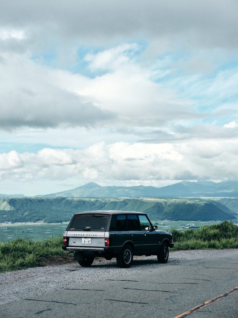 クラシックSUVならではの存在感と、阿蘇の広がる景色は相性抜群でした。