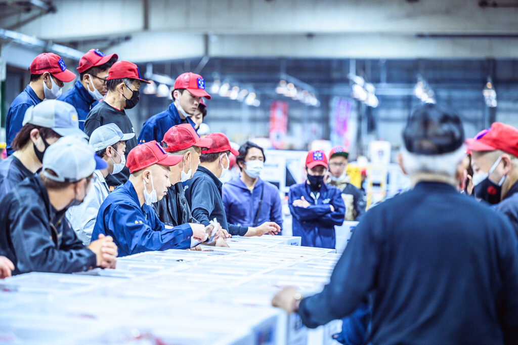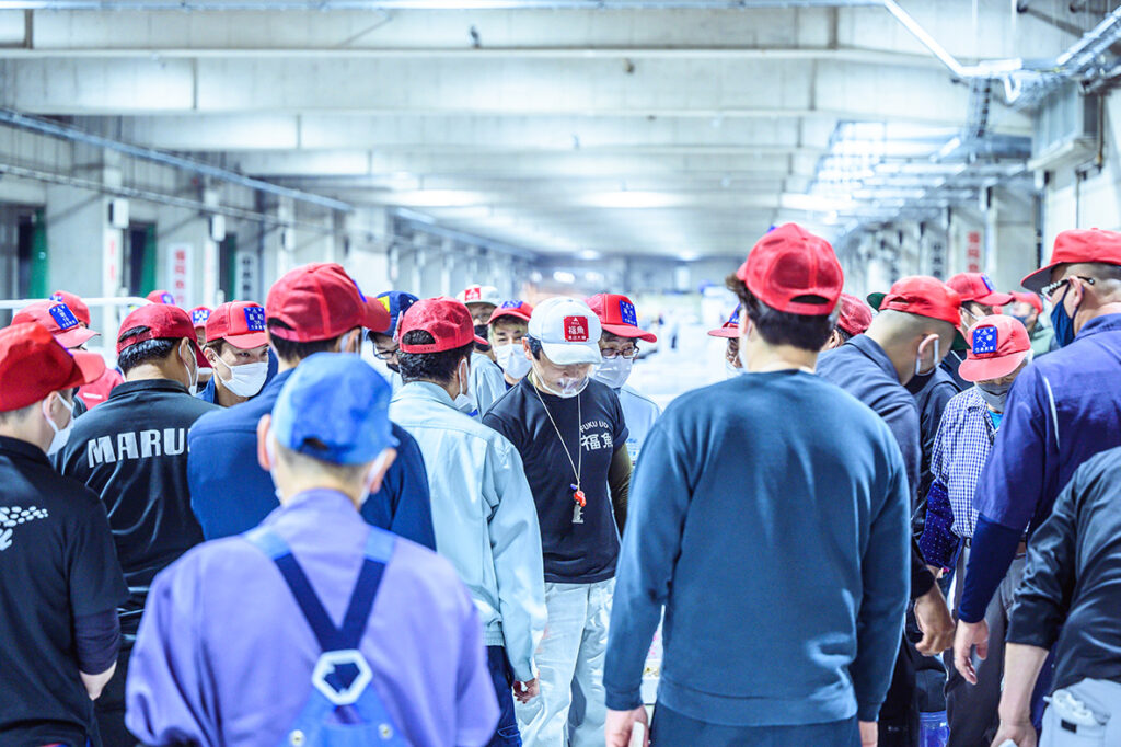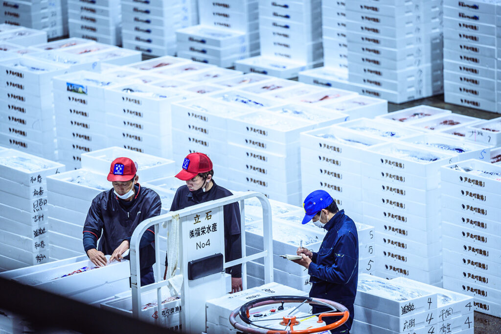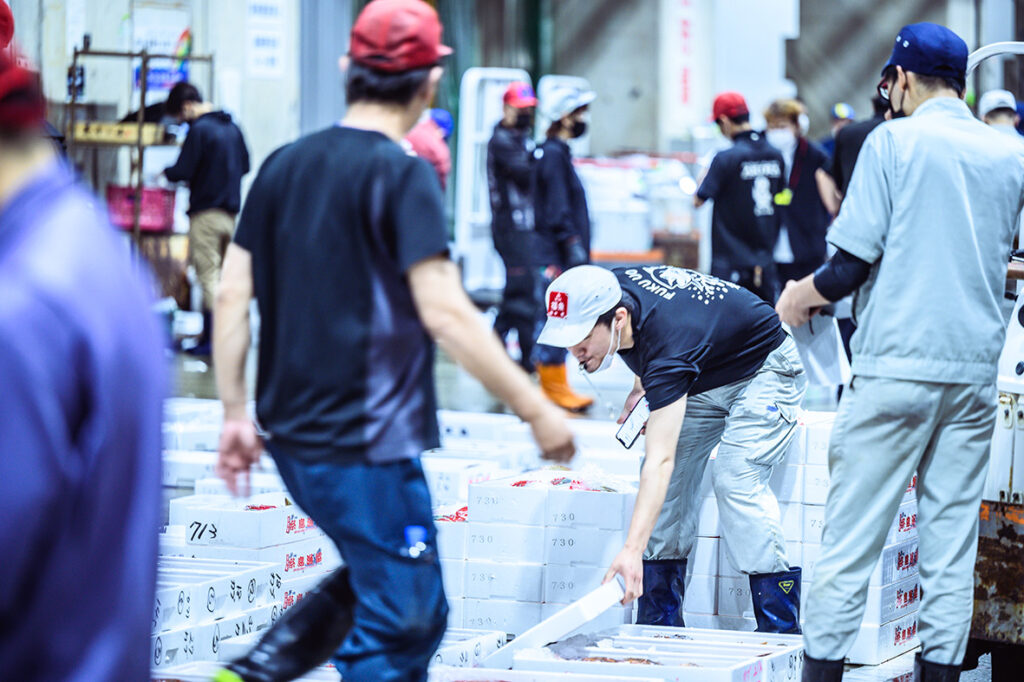 魚を運ぶ人、値を確認する人、声を掛け合う人。