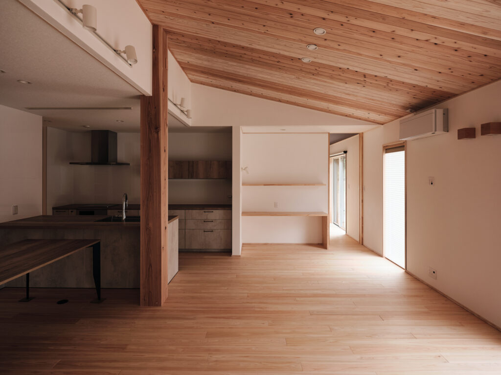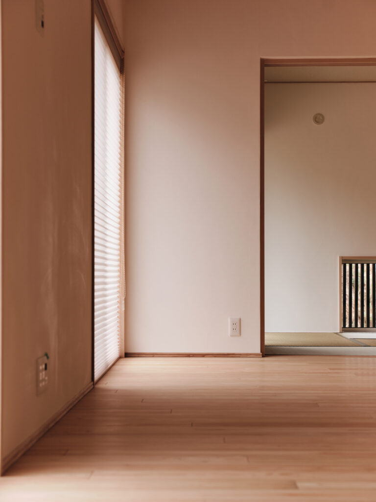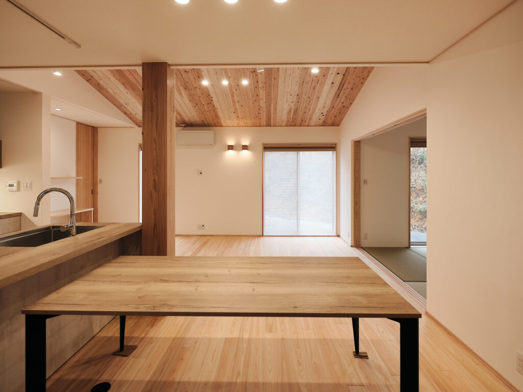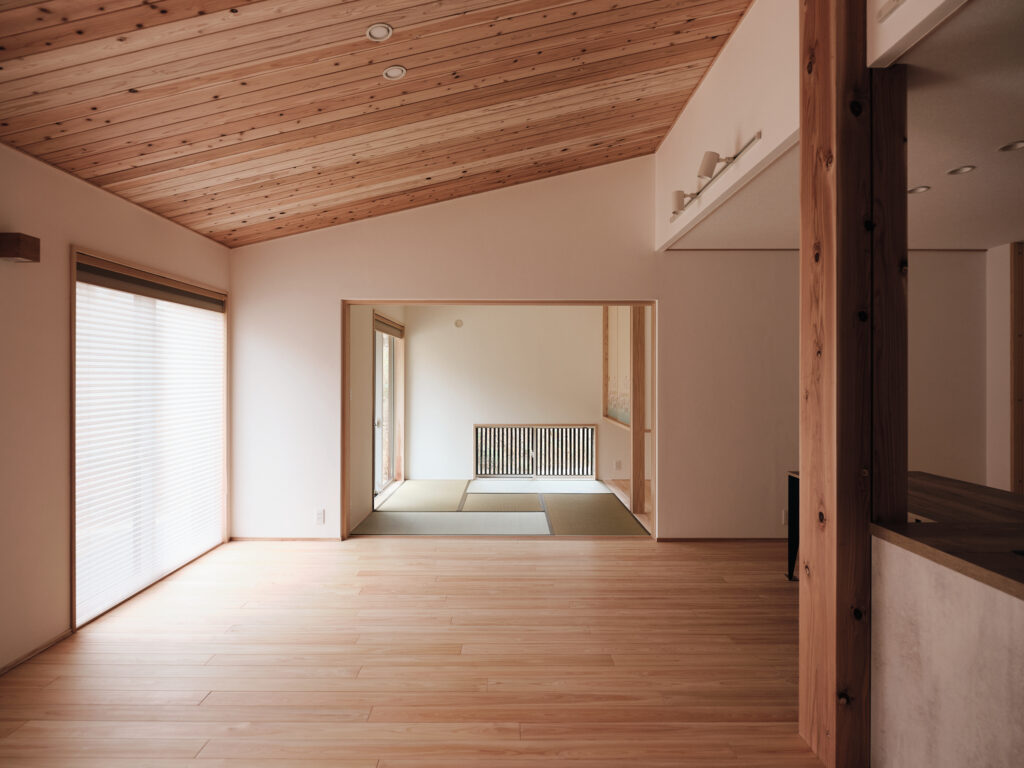 今回の住まいで印象的だったのは、LDKから和室へ視線が抜けるつながりの気持ちよさです。段差や枠のライン、天井の勾配、窓の位置関係がきれいに設計されていて、写真でもその魅力がストレートに伝わる空間でした。