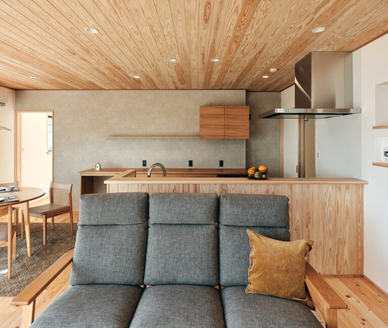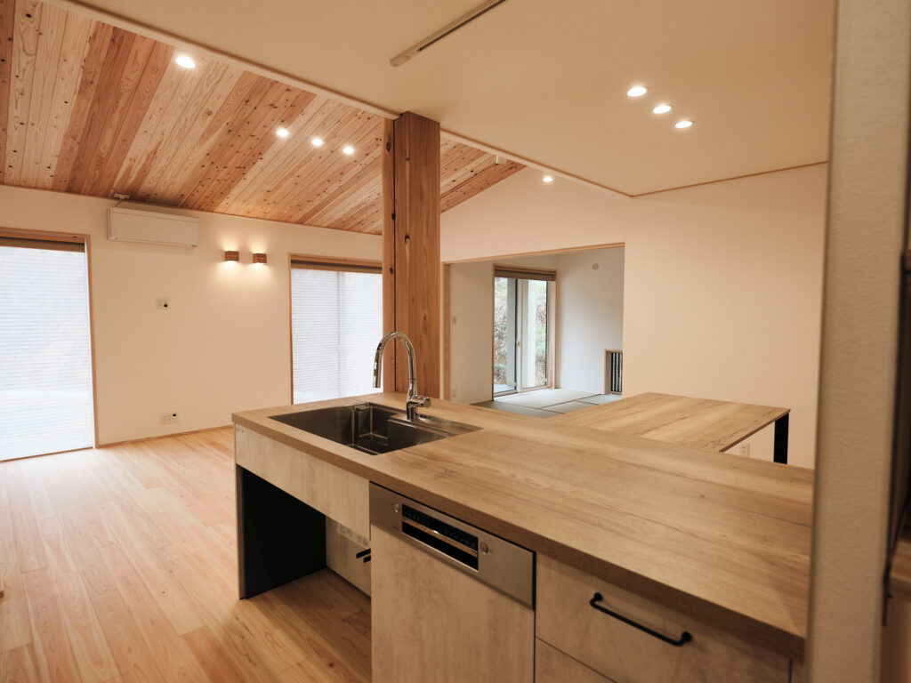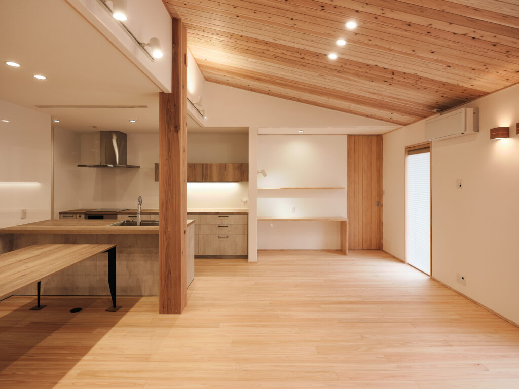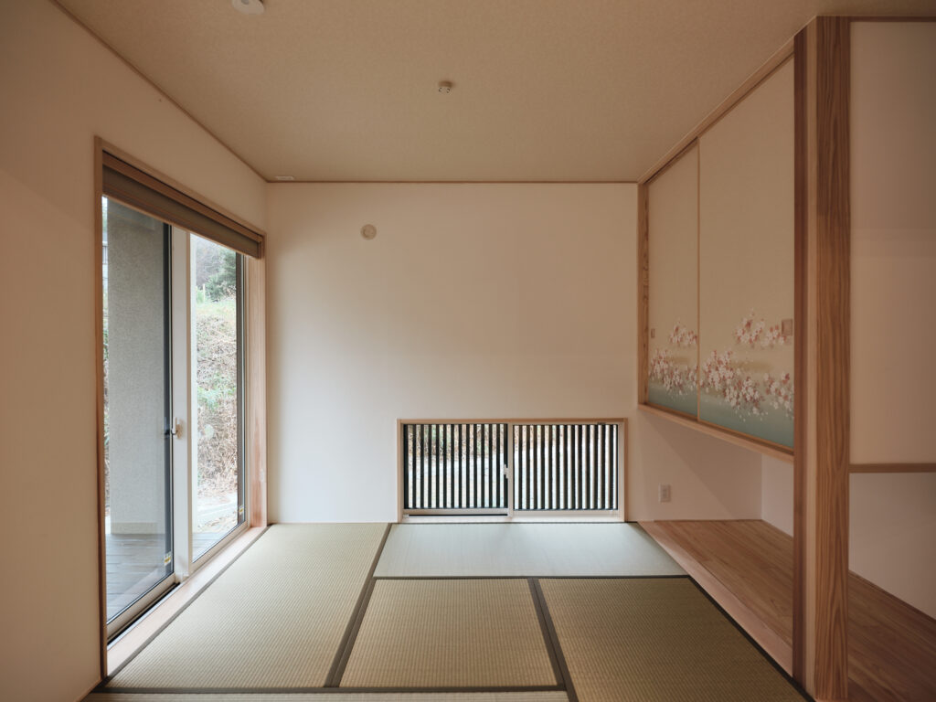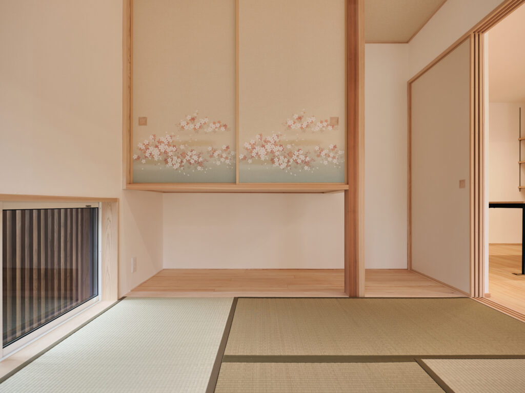 今回の住まいで印象的だったのは、LDKから和室へ視線が抜けるつながりの気持ちよさです。段差や枠のライン、天井の勾配、窓の位置関係がきれいに設計されていて、写真でもその魅力がストレートに伝わる空間でした。