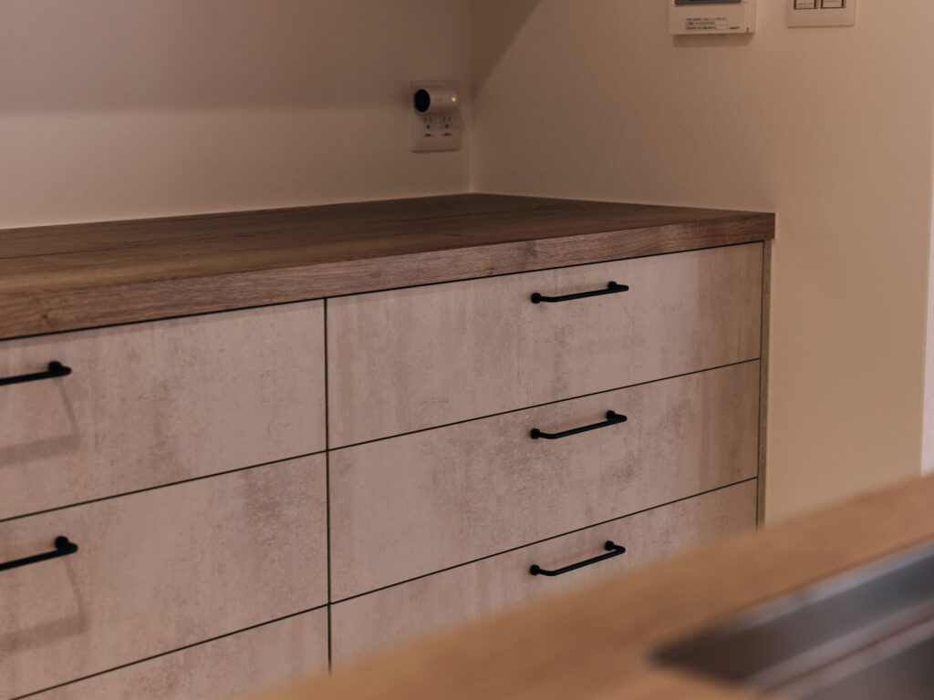 キッチンまわりは、設備のステンレス、白い面材、木目の収納が同居し、反射や色かぶりが起きやすいポイントです。特にレンジフードやキッチンパネルは映り込みが強く、撮影の難易度が上がります。今回は、反射の出方をコントロールしながら、作業台の質感や引き出しの陰影がきちんと伝わるように撮影しました。